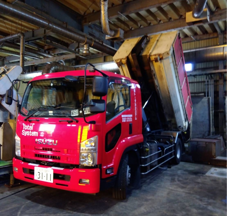 車両にて残渣の収集・運搬⇒破袋機へ投入⇒分別(動物性残渣と廃プラスチック類に分別)⇒動物性残渣は堆肥化施設へ搬入